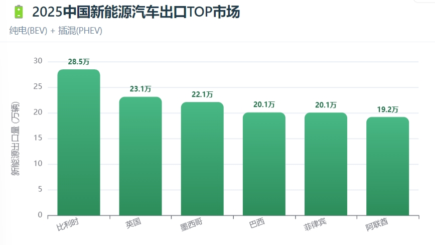 新能源汽车出口方面,前五大市场分别为比利时、英国、墨西哥、巴西和菲律宾。这些市场增量显著,其中墨西哥增长14.06万辆,阿联酋增长11.52万辆,英国增长11.19万辆,表现出新兴市场与发达经济体在新能源领域的同步发力。