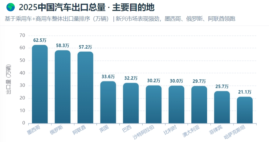 从整车出口总量看,前十大出口国家依次为:墨西哥(62.52万辆)、俄罗斯(58.27万辆)、阿联酋(57.19万辆)、英国(33.56万辆)、巴西(32.21万辆)、沙特阿拉伯(30.22万辆)、比利时(30.01万辆)、澳大利亚(29.74万辆)、菲律宾(25.67万辆)和哈萨克斯坦(21.15万辆)。其中,墨西哥超越俄罗斯成为最大出口市场。