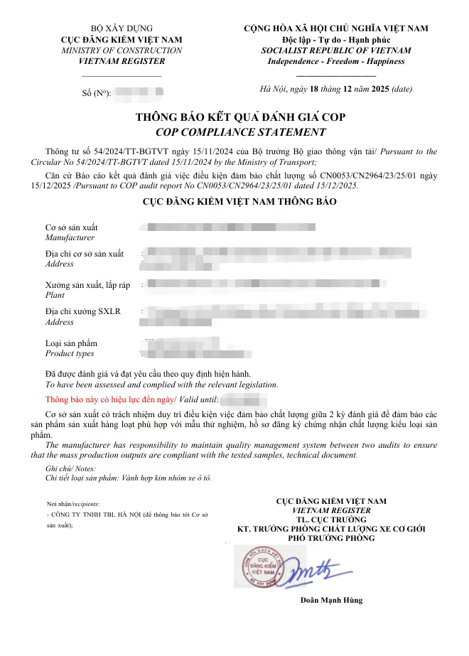 Through professional collaboration with ARC Parts, wheel manufacturers have successfully completed the Conformity of Production (COP) assessment and obtained the COP certification, marking a solid step forward in the Vietnamese market.