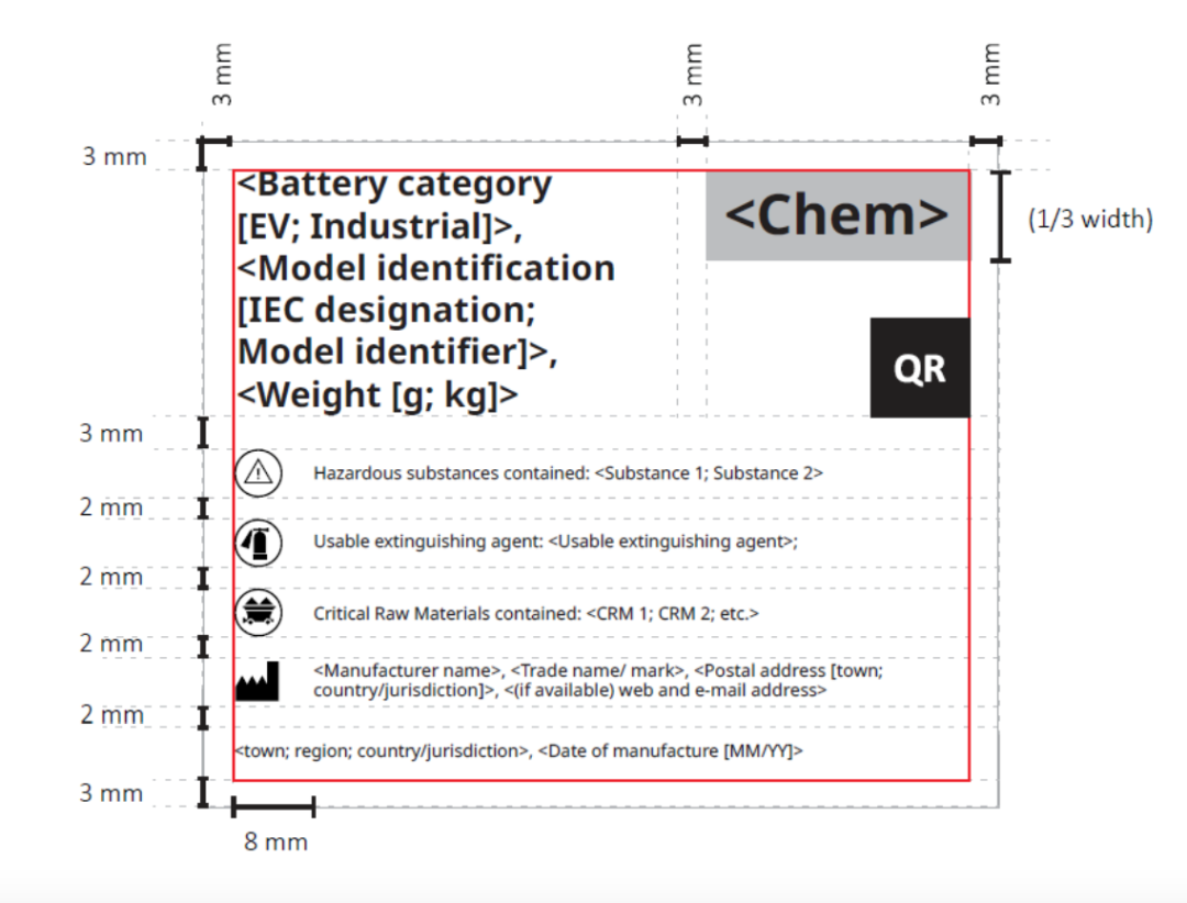 为统一标签要求规范并针对标签设计、尺寸与位置给出详细规定,同时,草案给出电动汽车电池在内的各类电池标签示例,下图为电动汽车电池标签示例: