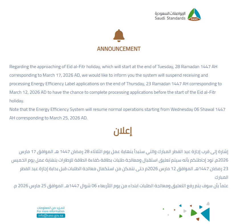 鉴于开斋节假期即将到来,SASO能效系统将于2026年3月13日起暂停接收及处理能效标签申请。系统预计于2026年3月25日恢复正常运行。